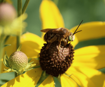 Although our human eyes are drawn to the yellow “petals” of the ray florets, those florets are sterile and offer no reward to insects; all the good stuff for the bees is found in the disc florets that comprise the rounded “cone” of the coneflower. In addition to many species of our native bees, R. pinnata is visited by wasps, flies and butterflies, and its seeds can be eaten by goldfinches over the winter. And best of all, it is also host to the extraordinary camouflaged looper, a caterpillar that decorates itself by snipping bits of flower petals and attaching them to its back with silk (pictured below)!