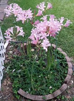 Some are called “spider” lilies, not to be confused with Hymenocallis, which is a different genus. The popular holiday flower commonly called “Amaryllis,” is a Hippeastrum. The true Amaryllis is the Belladonna Lily. Other relatives include Narcissus (Daffodils), Galanthus (Snowdrops), and Leucojum (Snowflakes). When we moved in, there were just a few Surprise lilies, planted close to the entrance of the storage area under the addition to our house. I dug them up and moved them a few feet to a place where they were less likely to be stepped on. They didn’t bloom the next year, but the following year they did. Since then, the clump has grown from 6-8 blooms to 20 or more!