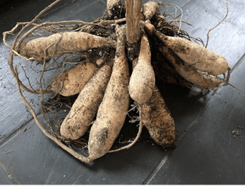During the growing season, both tubers and rhizomes have grown beyond their spring planting size. Use a garden fork to loosen the soil around the plant and gently lift the tubers from the ground while being careful not to cut into or skin the tubers which can allow disease organisms to enter and lead to rot. Remove soil from the tubers and rhizomes. Clumps can be divided in the fall or spring. Let tubers and rhizomes dry and “cure” out of direct sunlight and allow loose soil to fall away before storage. Label stored dahlias—you can use a felt-tipped pen to write the name/color directly on the tubers.