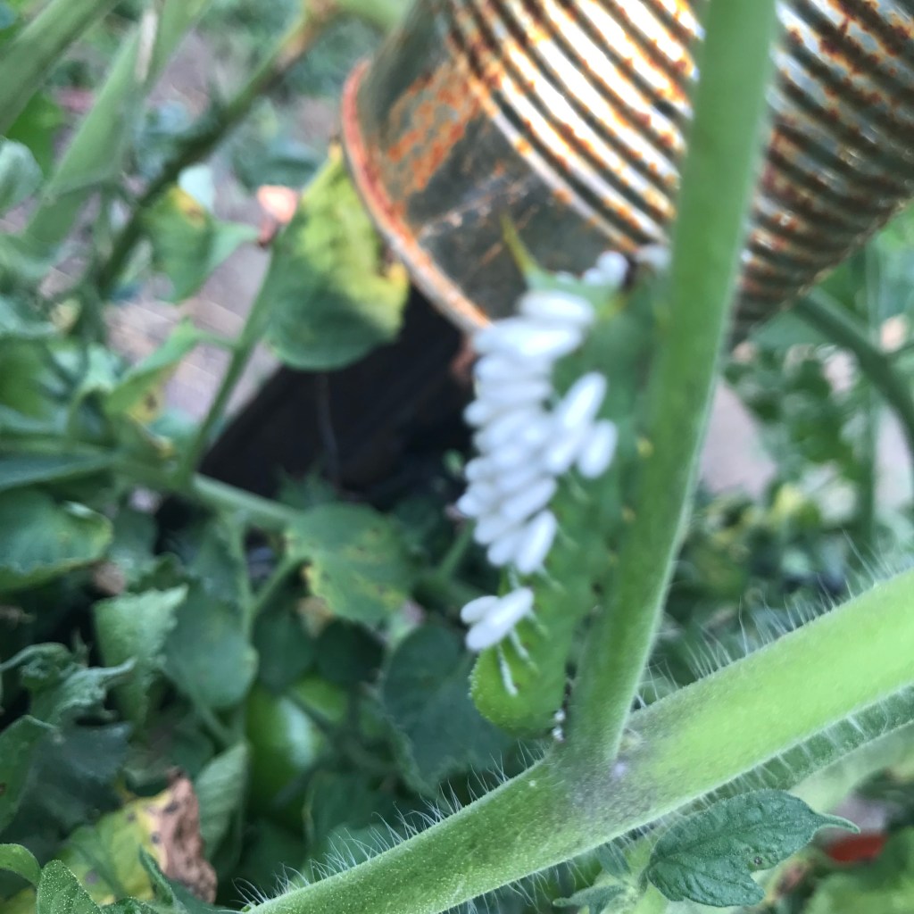 One insect that we did find in large populations but not until September, which seemed unusually late, was hornworms. Not only can they decimate tomato plants in a very short period of time, but they are large and nasty looking. I probably picked off about 30–50 worms over a 10–14 day period. A few were covered in white eggs that look a lot like white rice protruding from the worm’s body. Those hornworms I left alone. Braconid wasps, Cotesia congregata, lay their eggs on hornworms to provide their larvae food, killing the hornworms in the process.