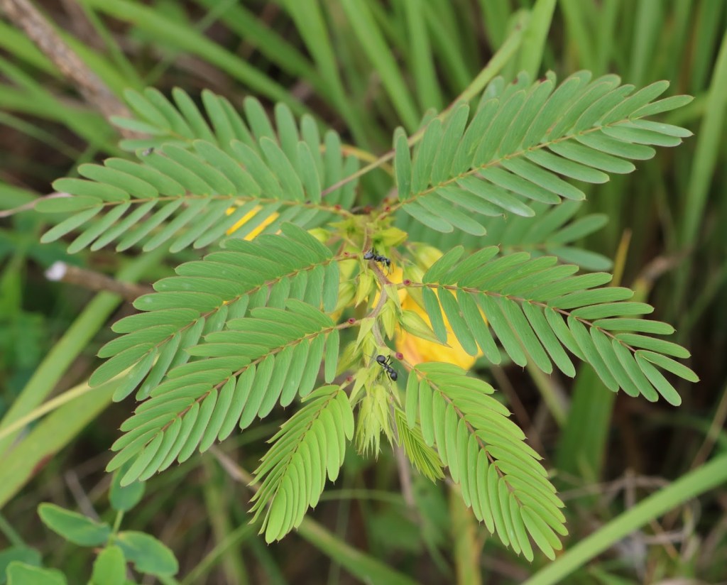 I first learned of “extrafloral nectaries” when researching the partridge pea, which has fairly large nectaries on its leaves that are easily visible by the naked eye. Its foliage is often crawling with ants and other small insects, and if you watch closely you can see them pausing at the little nectar pots.