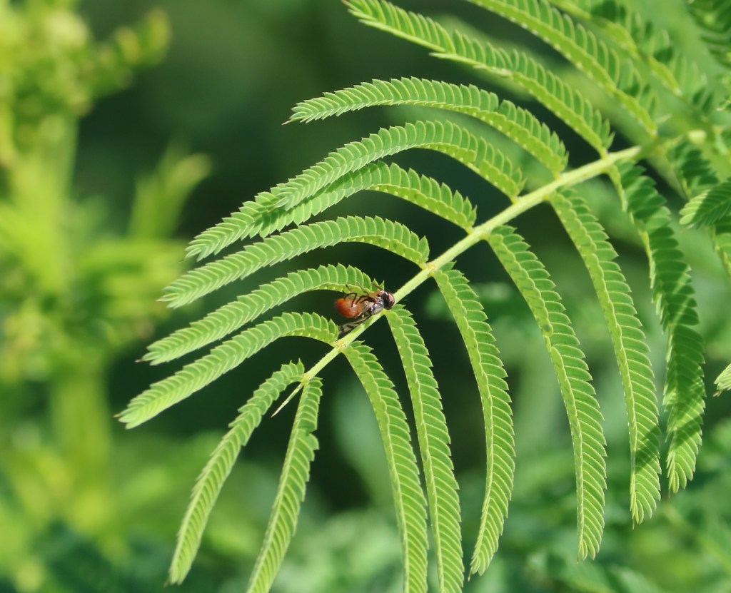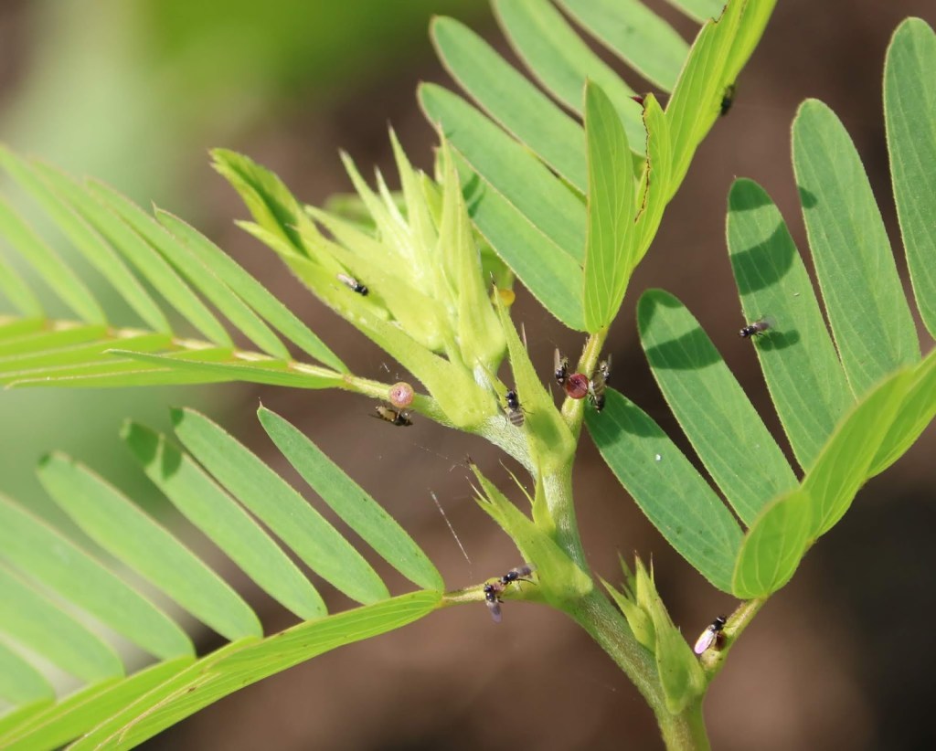 When I observed an ant on the leaves of Illinois bundleflower, another plant in the legume family like the partridge pea, I wondered if it, too, had extrafloral nectaries to lure insects as a protective squad. I examined the leaf but was unable to find any obvious pots like the partridge pea had. Research online confirmed that the Illinois bundleflower did indeed have extrafloral nectaries, so I was determined to find them.