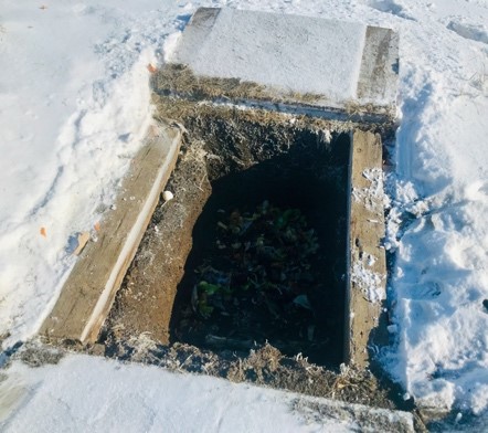 What about in the winter when the frozen ground prevents digging? You can either save all your kitchen scraps, leaves, and other materials in a large covered bucket or trash can until spring thaw or, like me, dig a trench and cover it throughout the winter. Then whenever you have a bucket of scraps it gets emptied into the trench and remains there (mostly frozen) until spring thaw when you can begin the process of burying it.