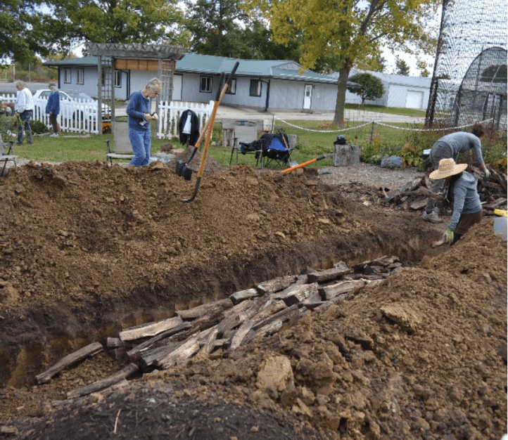 Once the correct depth was reached, the Master Gardener team began layering materials in the newly-formed trench. First green wood, followed by aged or decaying wood, followed by compost alternated with dried manure, and a large quantity of plant debris including canna stalks and tomato vines, followed by more compost and manure, and finally the remaining compost and manure. The berm was topped off with a layer of straw to hold everything in place.
