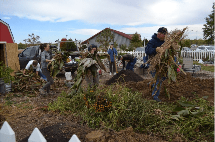 John measured an area for the three gardens aligned side-by-side and began digging. The trench, 4 feet wide by 24 feet long, was rototilled. Next, a team of Master Gardener volunteers removed the rototilled soil, and the strip was rototilled again and that soil removed. The rototilling and soil removal process continued until a depth of 30 inches was reached. That effort, John said dug through multiple layers of soil, sand and clay to reach the project’s goal: black earth located below the compacted clay.