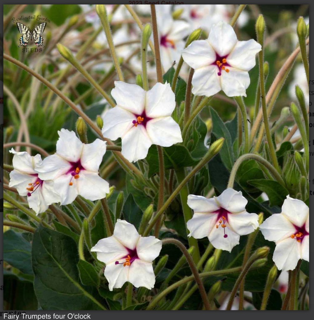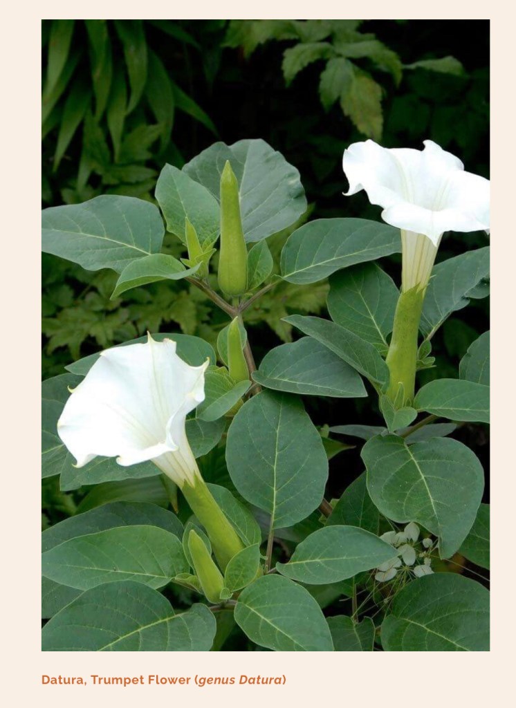 Woodland tobacco (Nicotiana sylvestris) with its giant tobacco leaves grows to 4 to 5 feet with 3-inch trumpet flowers exploding like fireworks on the top of the plant. Fairy trumpet 4 o’clock (Mirabilis longiflora) is a short vine with delightful white flowers with raspberry centers and long curving stamens. And then there is datura (family Solanaceae) trumpet flower. A spectacular trumpet flower 7 inches long and 5 inches wide! Wowzer are they incredible, but they are also poisonous so handle appropriately. This year I added a container with jasmine and Mandevilla to enjoy while sitting on the deck. The choices are endless!