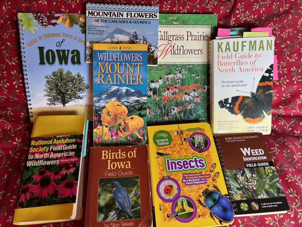 A few examples from our bookshelf include: the Iowa DOT’s “Guide to Common Trees & Shrubs of Iowa”; “Mountain Flowers of the Cascades and Olympics” by Harvey Manning; Lone Pine’s “Wildflowers of Mount Rainier” by Laird R. Blackwell; the Falcon Field Guide “Tallgrass Prairie Wildflowers” by Doug Ladd; the “Kaufman Field Guide to Butterflies of North America” by by Jim P. Brock and Kenn Kaufman; the National Audubon Society’s “Field Guide to North American Wildflowers “; “Western Region Birds of Iowa Field Guide” by Stan Tekiela; National Geographic Kids’ “Ultimate Explorer Field Guide – Insects” by Libby Romero; and Iowa State University Extension and Outreach’s “Weed Identification Field Guide.”