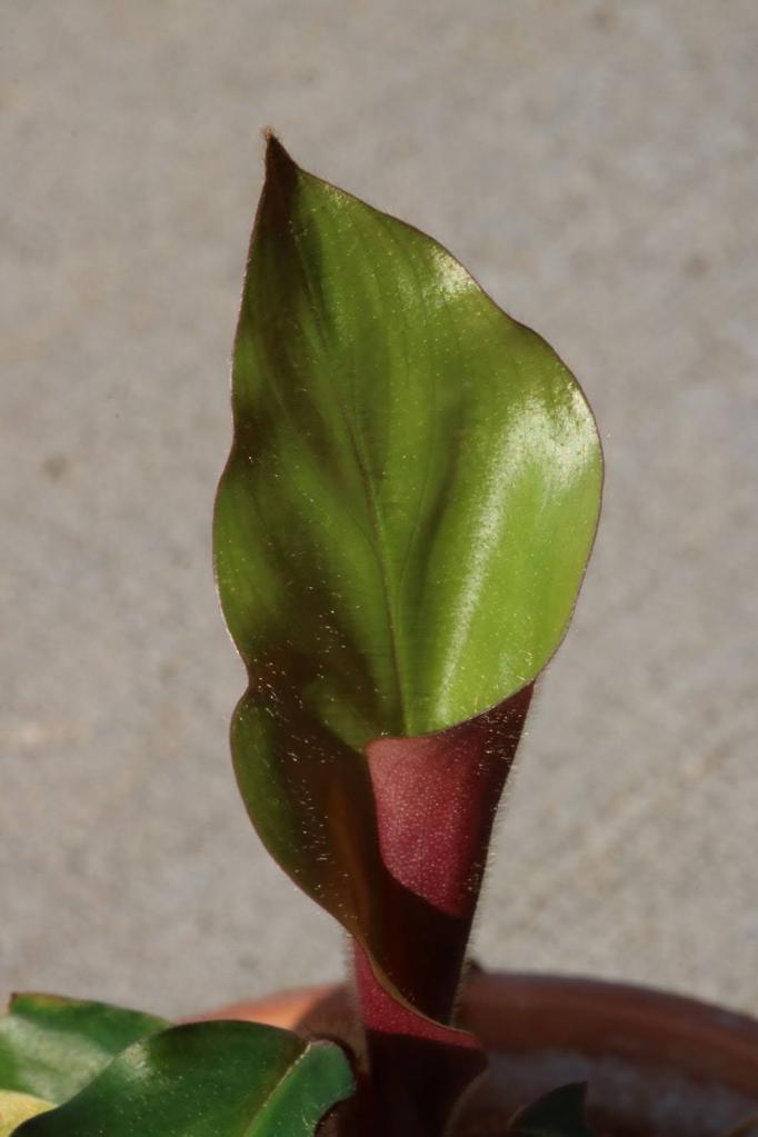 Calatheas1 and their relatives in the family Marantaceae (arrowroot or prayer plants) have a charming habit of folding up their leaves at night; the common name of prayer plants comes from the motion of the leaves resembling hands folding in prayer. This motion is accomplished by a swollen node at the base of the leaf blade called a pulvinus, which regulates the leaf movement via water pressure such that the leaves move to a more upright position at night, and open out to a horizontal position during the day.