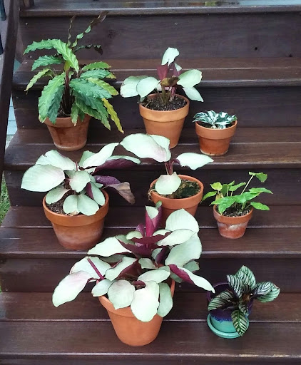Photos/Melessia Seranda. Calatheas-Collection: Top left: A few of the calatheas from my collection, enjoying a summer rain shower on the front porch. Top right: C. picturata (?), photographed at the Greater Des Moines Botanic Garden in 2019. Bottom left C. orbifolia, photographed at the Greater Des Moines Botanic Garden in 2019. Bottom center: Raindrops on a leaf of C. musaica, from my collection. Bottom right: An unfurling young leaf of C. rufibarba, from my collection.